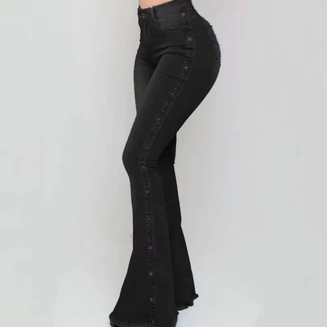 High waist and hip lifting design for flare jeans can present the curves of your leg well and make you look slimmer. Rivet wide leg design for flare pants will make you get lots of compliments from your friends. In addition, it is comfortable to wear due to its stretchy and breathable characteristics. Made from high-quality denim material, women flared pants are soft, breathable and comfortable.