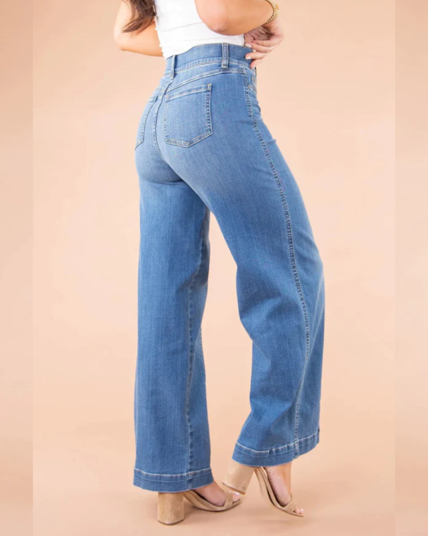 These inspired Seamed Front Wide Leg Denim Jeans Flare Jeans are the perfect wear everywhere with anything style. Designed with premium stretch denim, high-rise coverage and hidden core shaping technology, this pull-on jean puts a new twist on a retro silhouette.